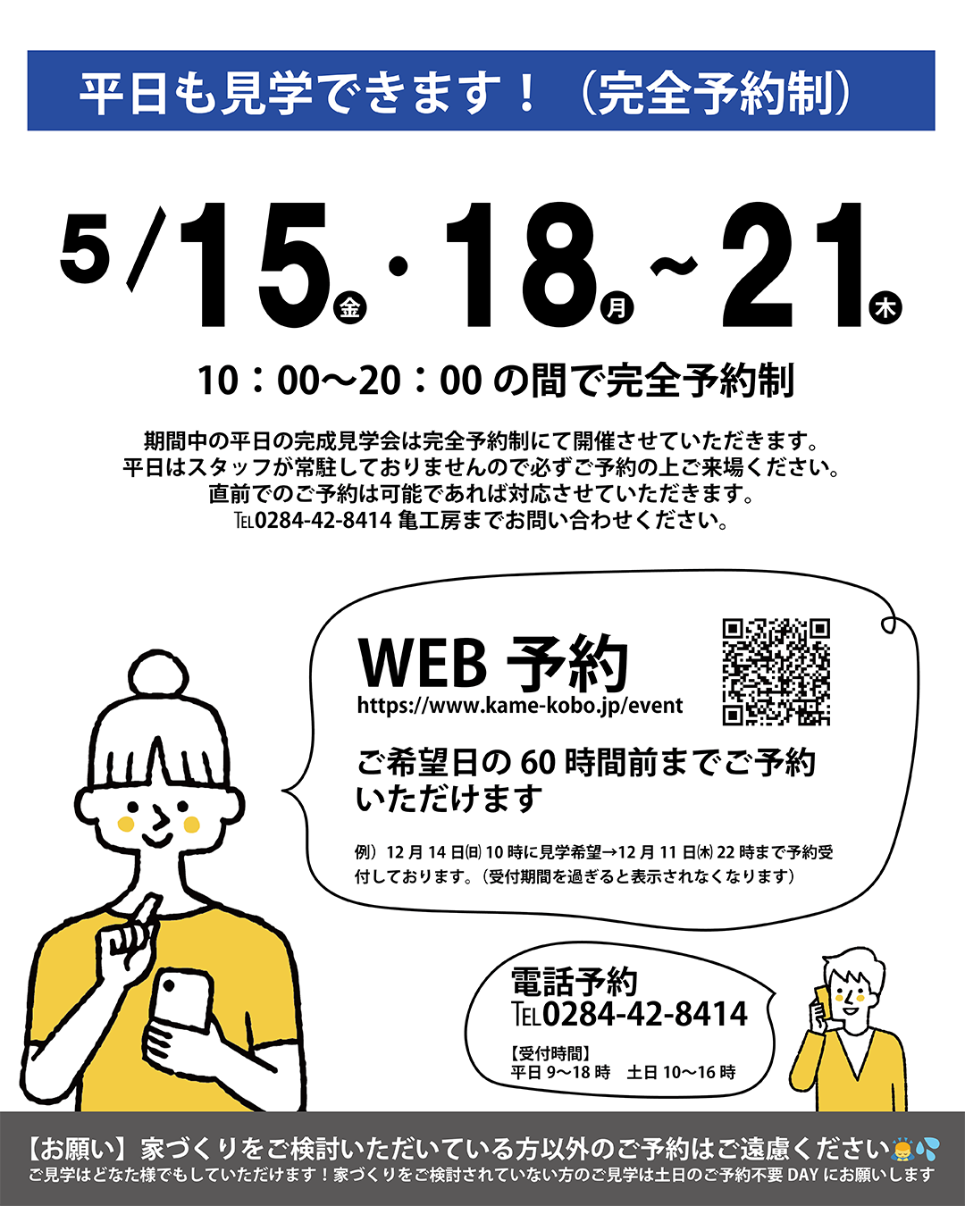 お電話でのご予約お問い合わせは0284-42-8414亀工房へお願いします(平日10時〜17時)
