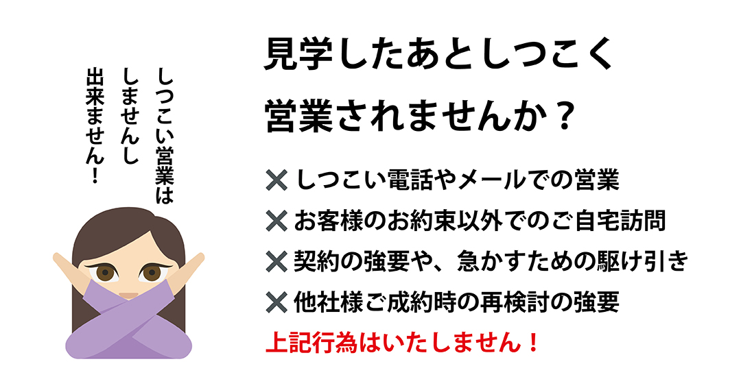 そのため、お約束した場合以外でお客様へ何度もお電話やメールで営業をしたり、ご自宅へ訪問したりすることはありません。