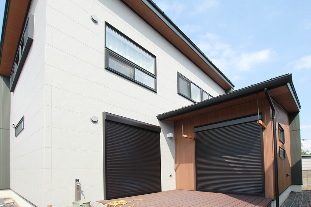 外観:ウッドデッキ:ライトブラウン、手動シャッター:2箇所 標準仕様(設計指定有)
