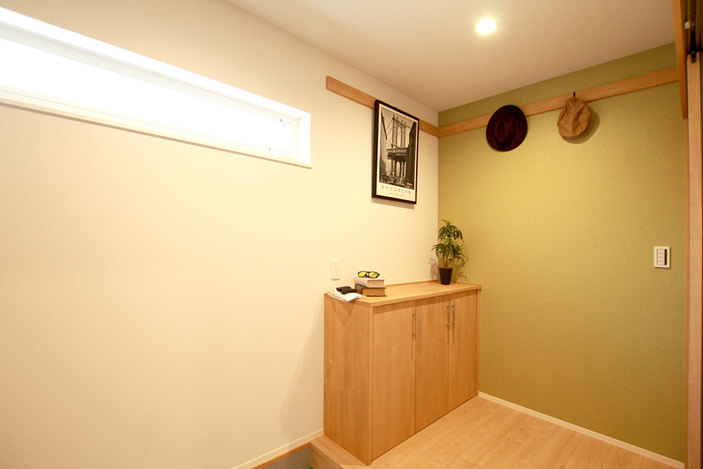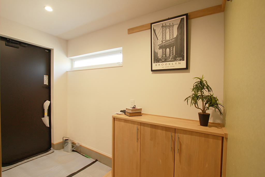 玄関ホール:長押風造作ピクチャーレール、造作収納