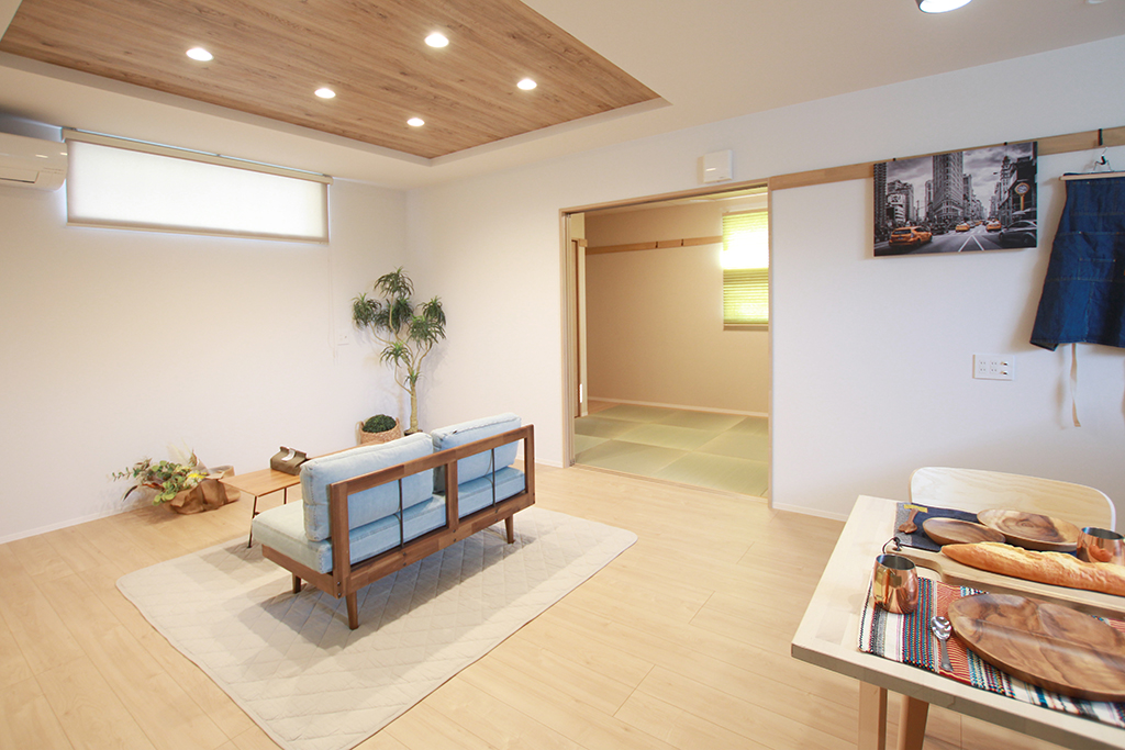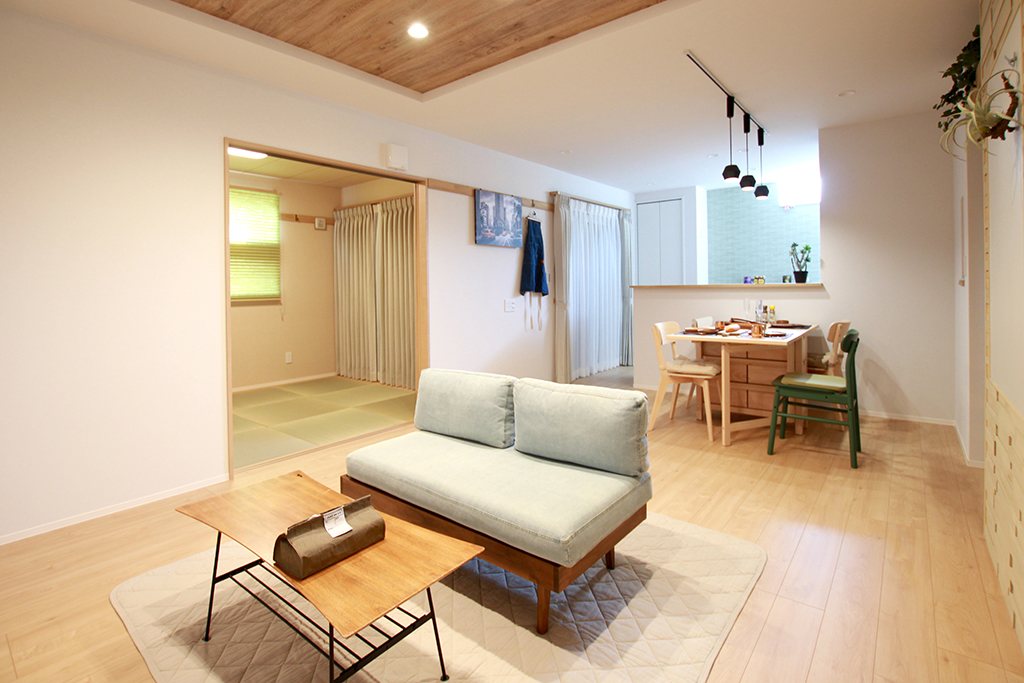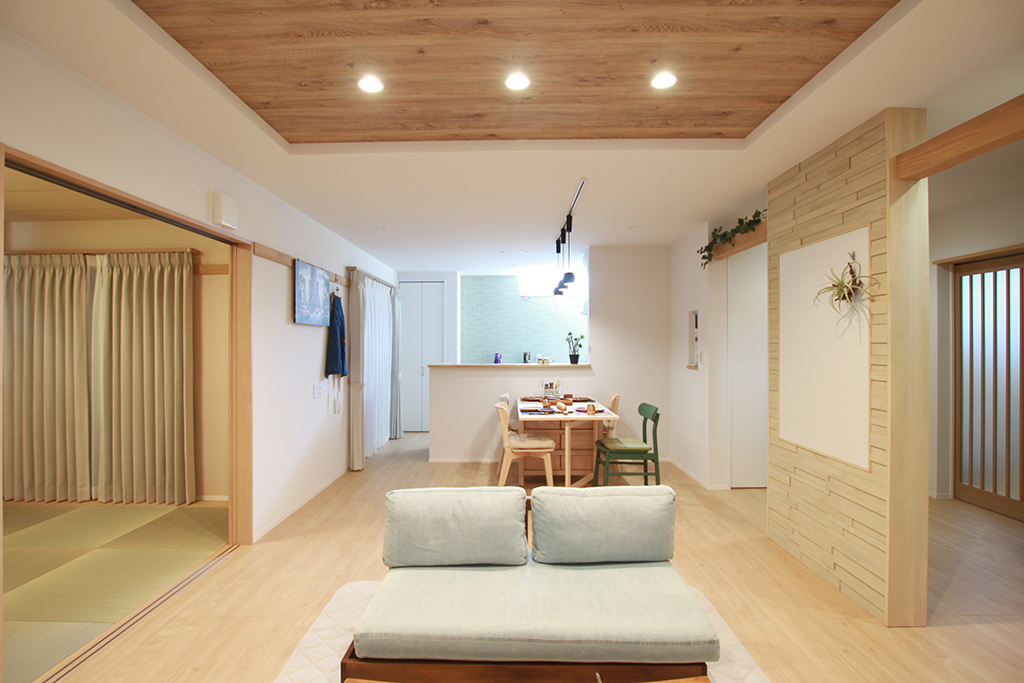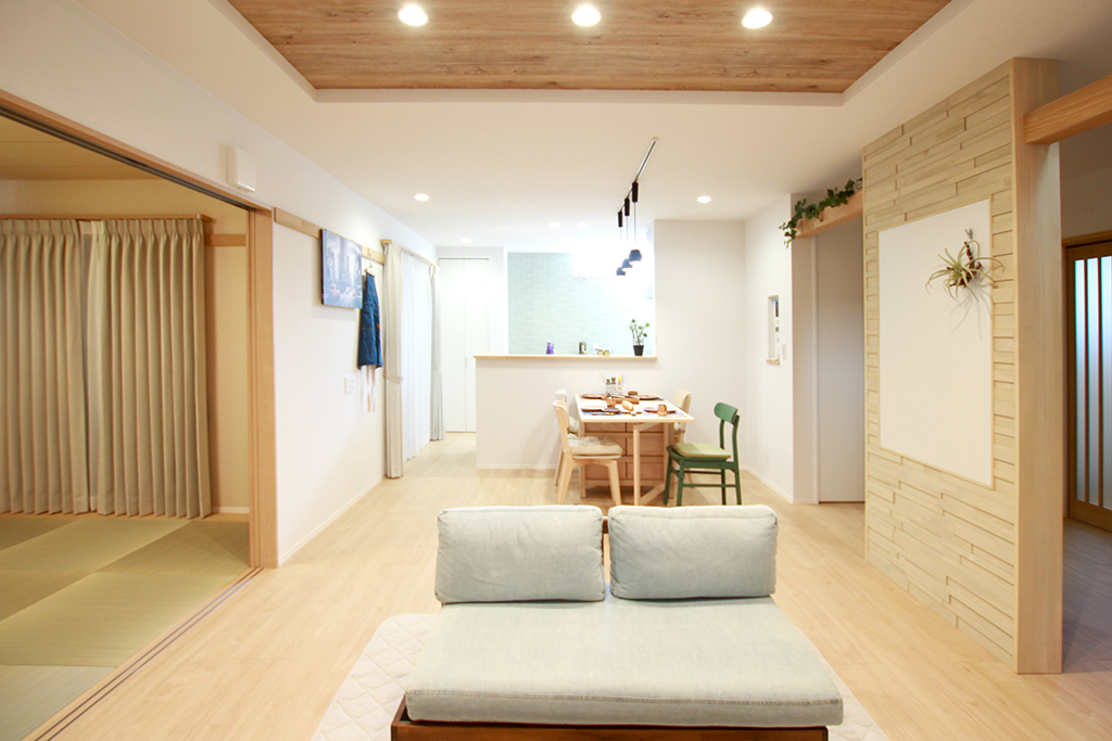 勾配天井で広々感じる空間デザイン。LDKと繋がる和室スペースのある平屋のおうち|I様邸