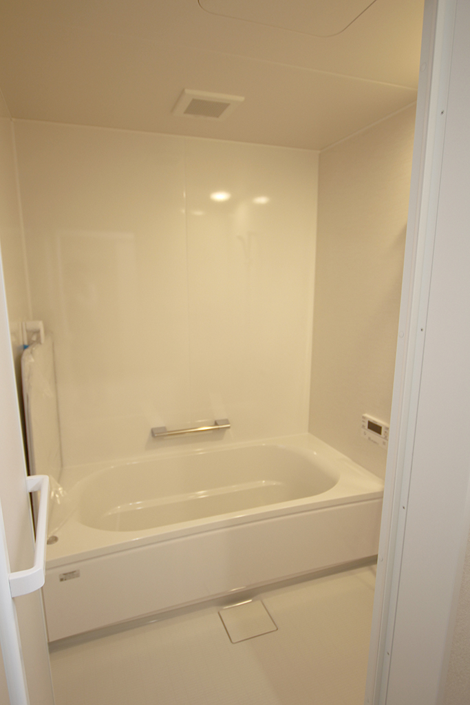 ユニットバス:リラクシア(タカラスタンダード)アクセント壁:ラミナストーンホワイト 床:高断熱仕様FRPホワイトグレー